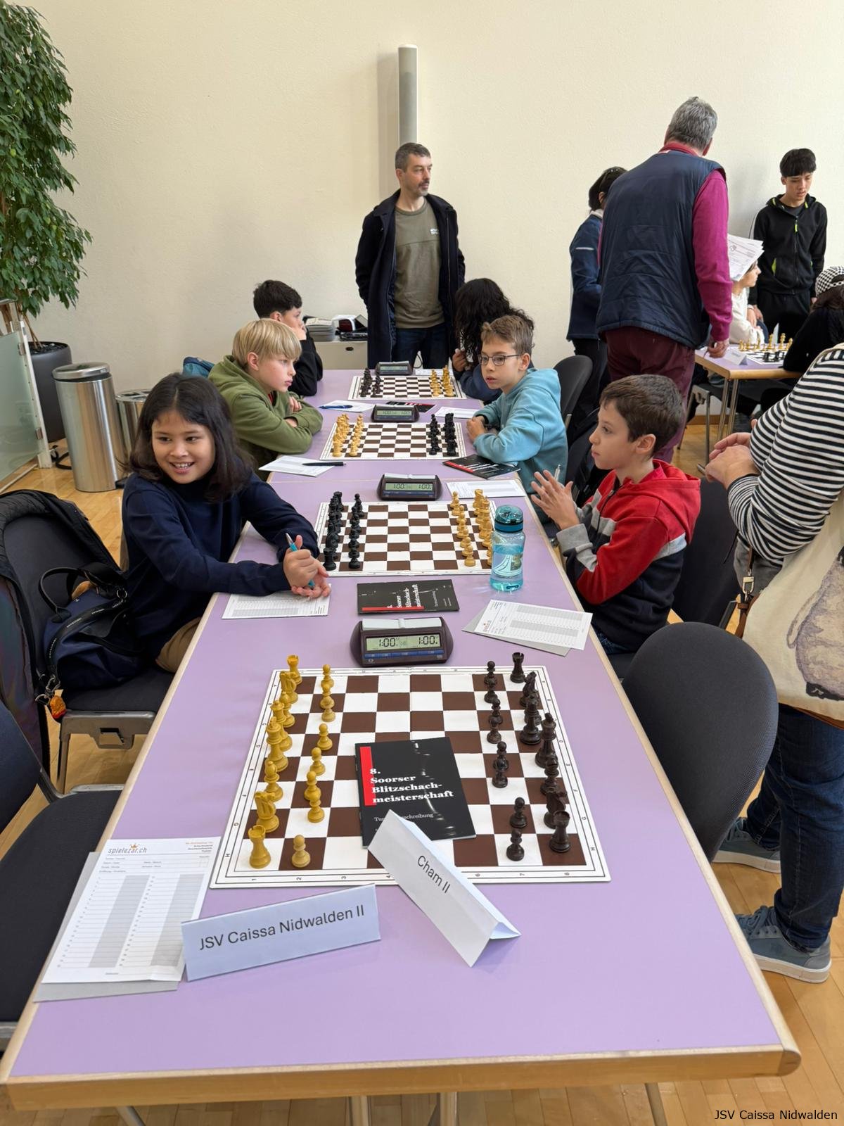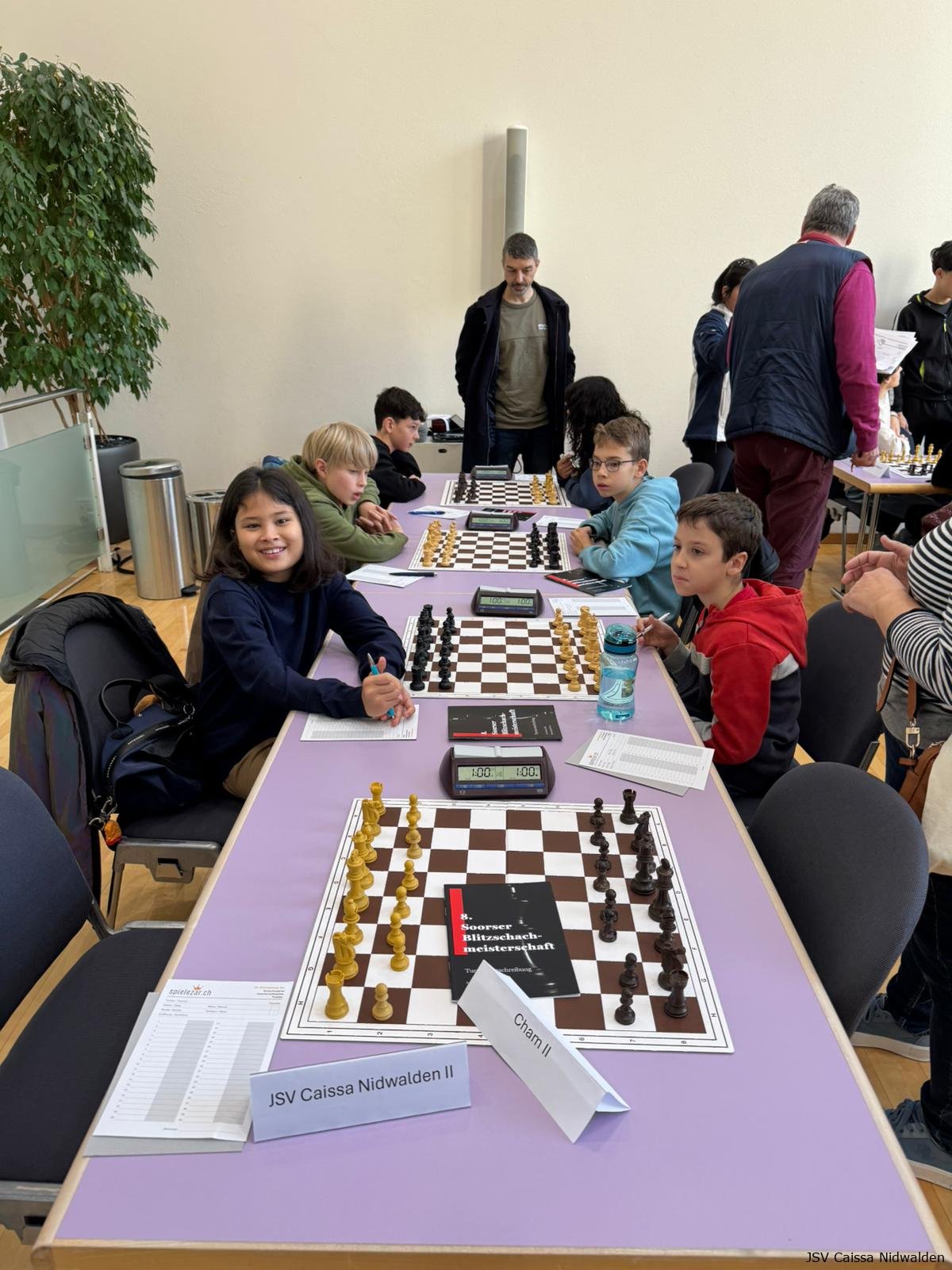 Cham trat nur mit 3 SpielerInnen an und so waren wir hier klar favorisiert. Ganz schnell fertig war Viktoria, leider mit einem negativen Ergebnis und das obwohl sie einen ganzen Turm voraus war. Trotz dieses Materialvorteils spielte sie viel zu schnell und liess sich die Butter noch vom Brot nehmen. Sehr schade ! Für sie und das Team ! Also 1:1